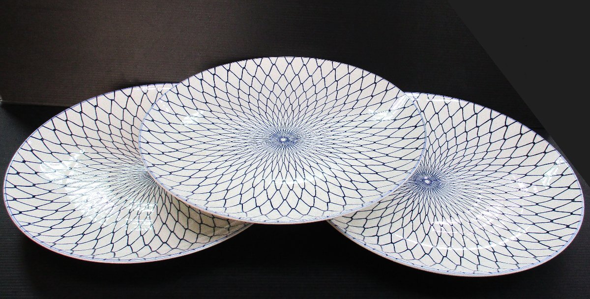 - ★98871 大皿 網目 3枚組 直径41.7x高さ5.5㎝ てっちり 刺身 活けづくり 土物 和食器 旅館 料亭 飲食店 中古★