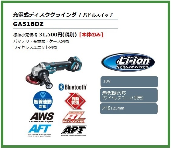 > マキタ 125mm 18V 充電式ディスクグラインダ GA518DZ (本体のみ) [パドルスイッチ]【ワイヤレスユニット別売】■マキタ純正/新品/未使用■