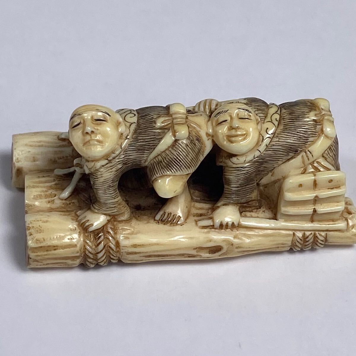 - 悦玉造 根付 時代物 提げ物 細密彫刻 細密細工 人物 筏 いかだ 銘あり 作家物 東洋美術 風俗画 細工彫刻 骨董品 アンティーク netuke