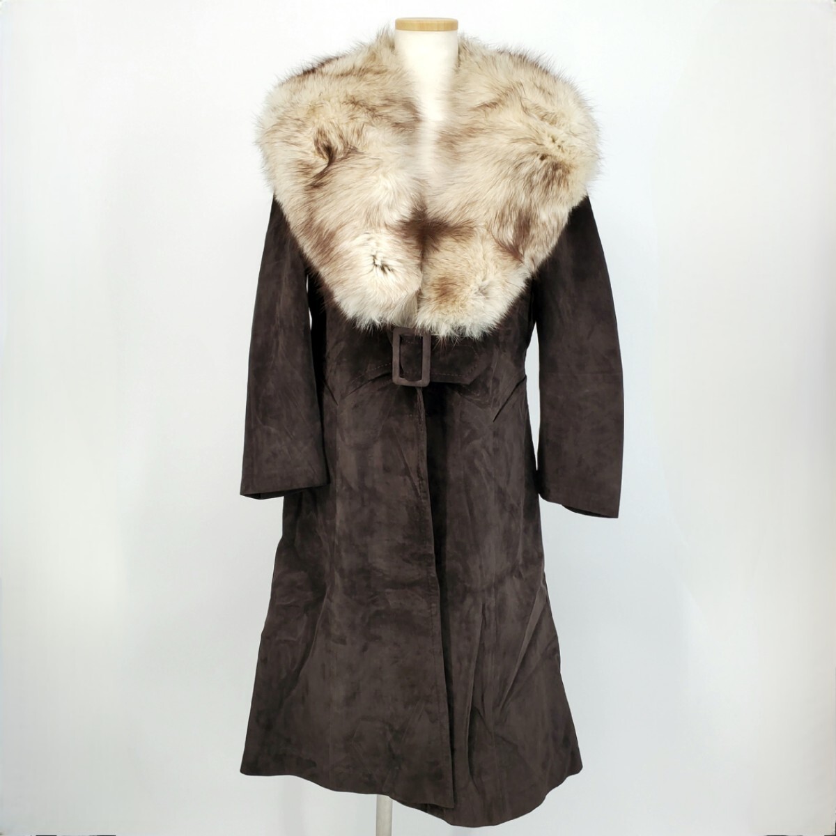 - /*a 【洗練された装いを叶える】 銀座 和光 WAKO ファー襟 毛皮 スエードレザー ロング コート 婦人服 レディース アウター 焦茶 ブラウン