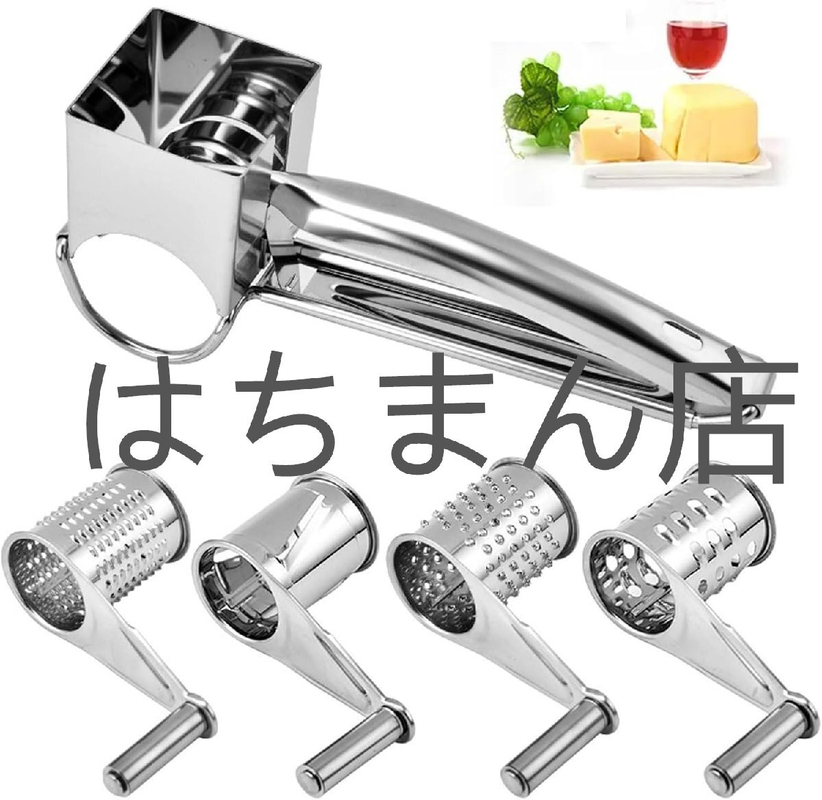 > 手回しチーズおろし器、ミニステンレス鋼の多機能ロータリーおろし金、4つのかんな付き、レモン用のポータブルハンドグラインダー