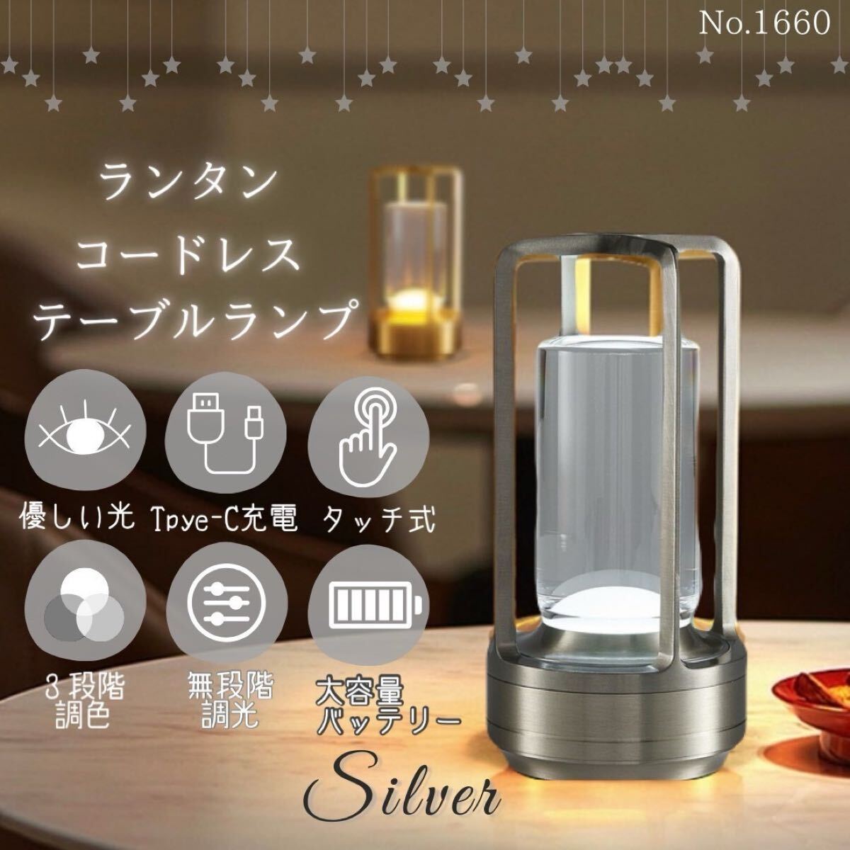 - .ランタン コードレス テーブルランプ シルバー 間接照明 卓上ライト タッチ制御