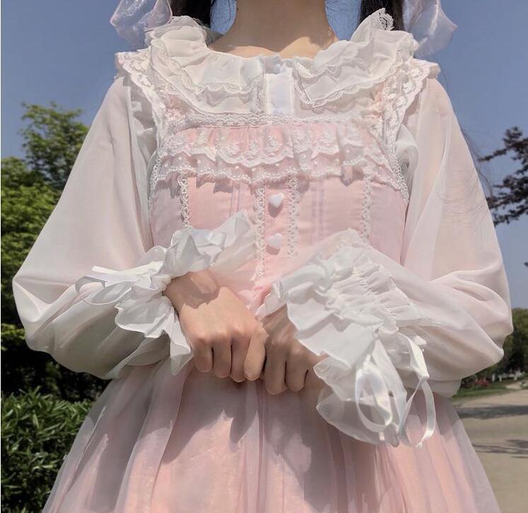 - ホワイト フリルレースドールカラー 長袖 ロリィタインナーブラウス ワンサイズ