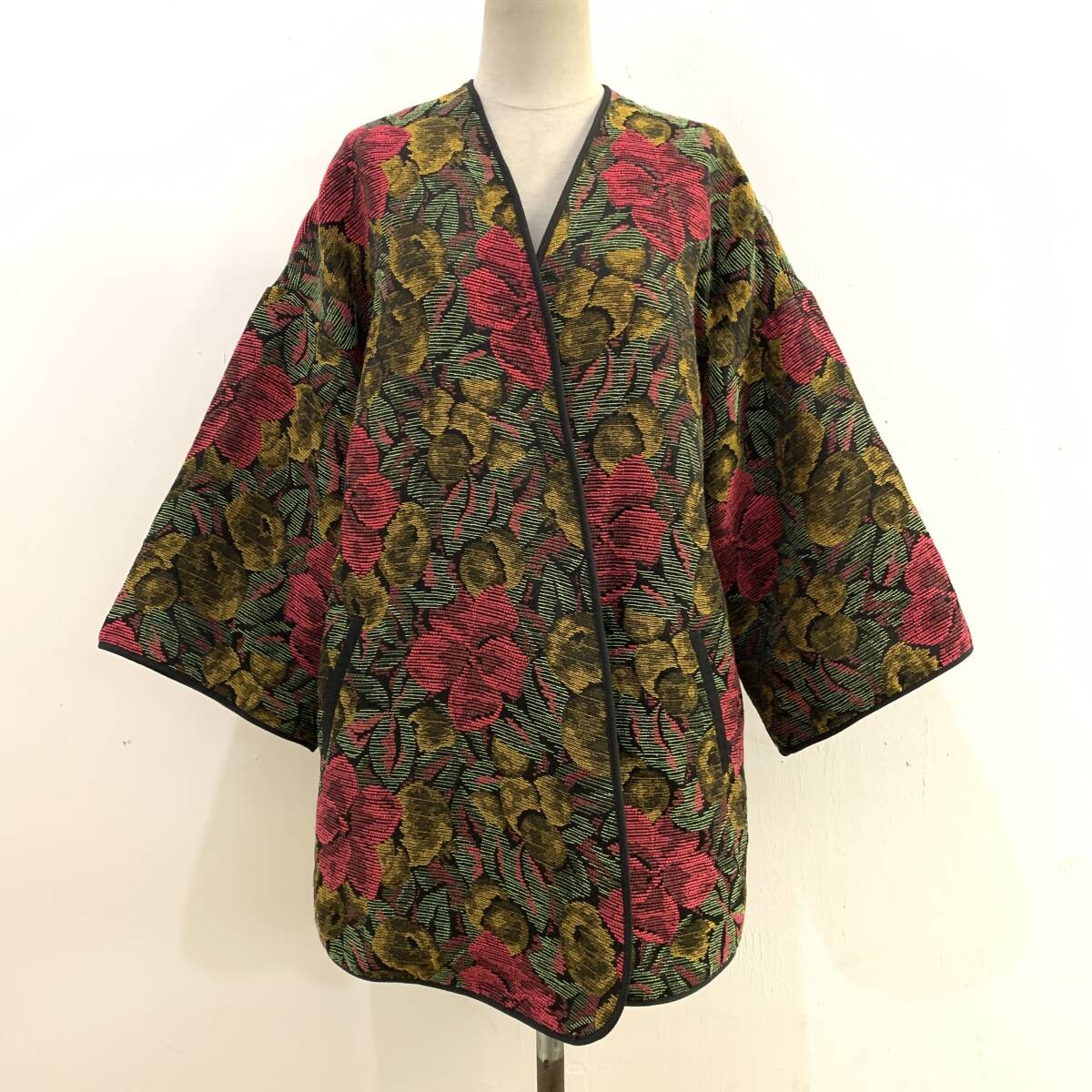 > ☆ZARA trf-outerwear ザラ 総柄 花柄 ジャガード織 ノーカラージャケット ガウンジャケット ブラック系 サイズS-M【送料一律/同梱可能】I
