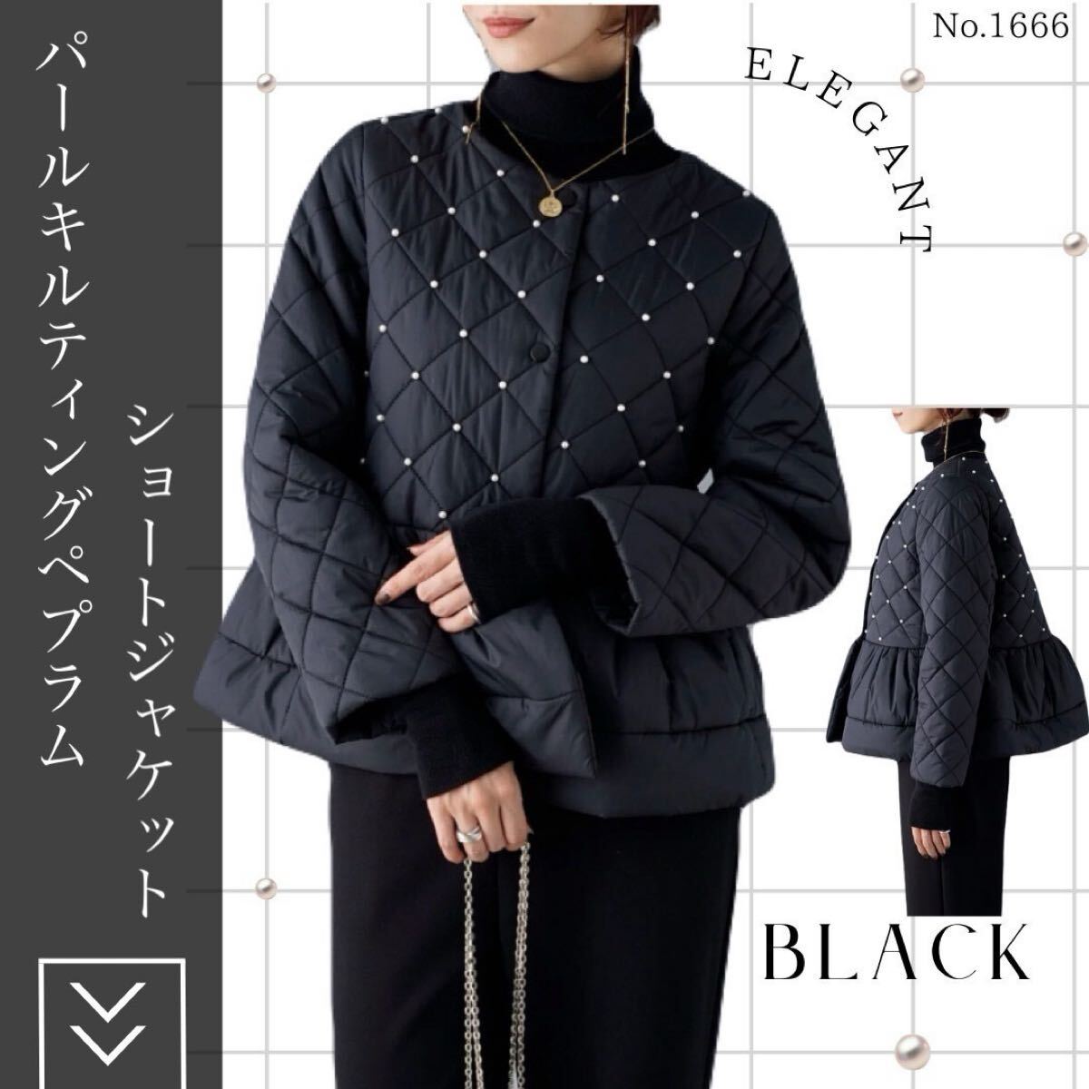 - パール キルティング ペプラム ショートジャケット ブラック ペプラムブルゾン
