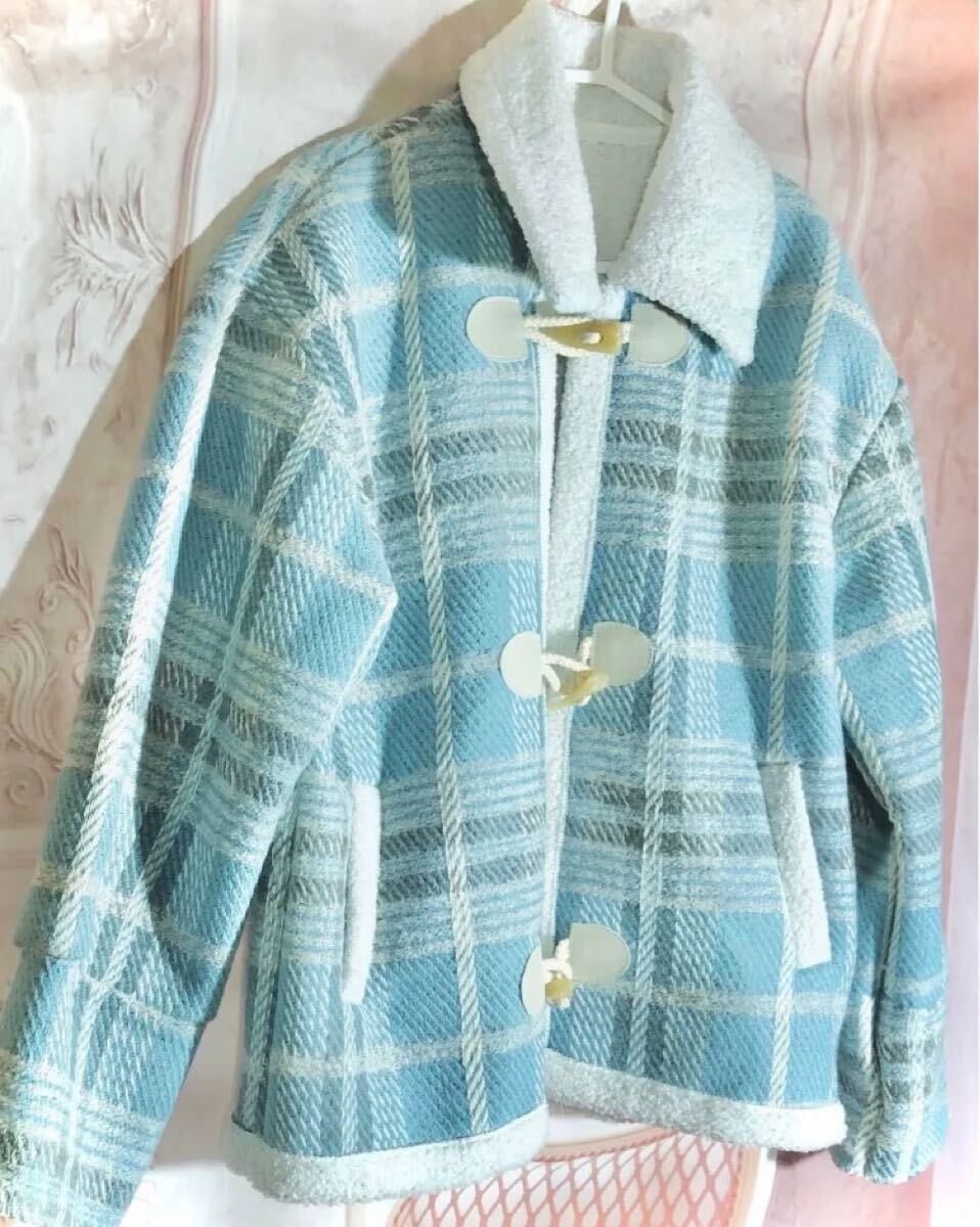 > キッズアウター ブルーホワイトチェック柄 裏ボアコート 150 美品 秋冬