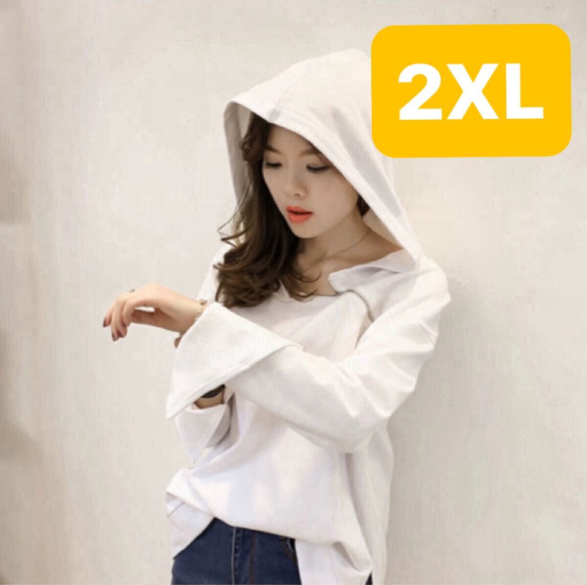 > オフショルダー パーカー 2way ジップ 長袖 トップス フード プルオーバー トレンド ストリート オルチャン セレブ セクシー 抜群 白 2XL