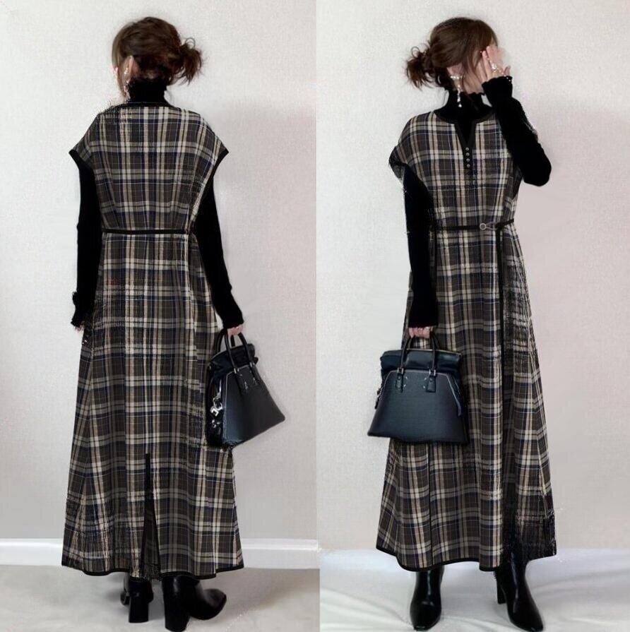 - 秋冬/ノースリーブワンピース カジュアル チェック柄 ベルト付 ジャンパースカート 大人 ロングワンピース オフィス通勤 Aラインワンピース