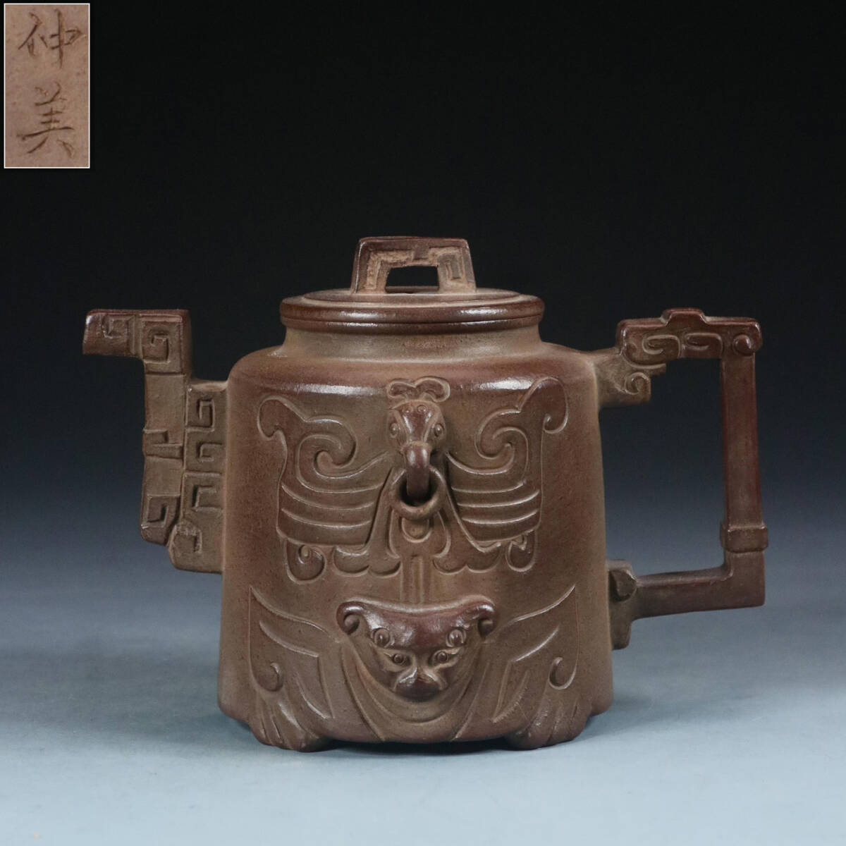 > 古陶芸 紫砂壷 明時代 【陳仲美】 製 「獣面双環壺」 紫泥 煎茶 急須 茶道具 唐物 時代物 茶器 容量480cc LT-241229