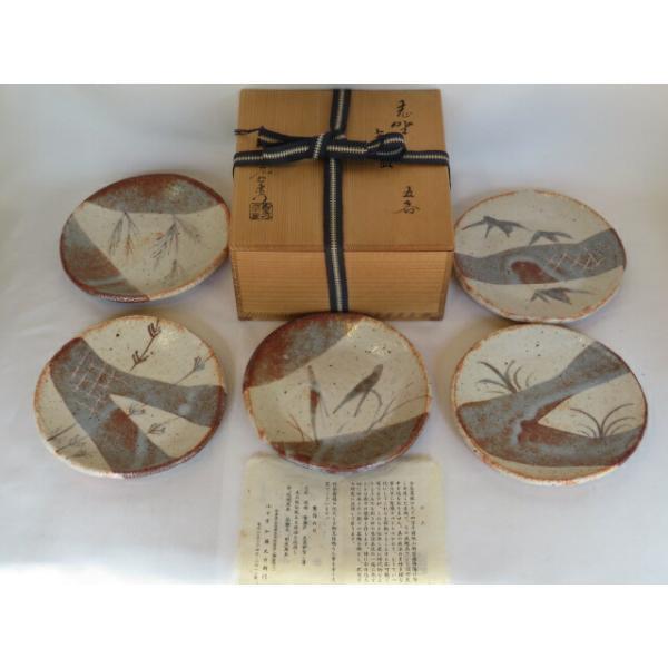 - (八月☆特売品)岐阜県 山十窯 加藤光右衛門作 志野絵替 銘々皿五客〈税込・送料込〉【中古・美品】