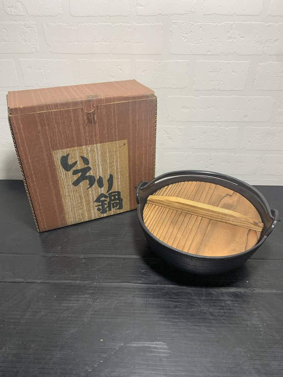 - 【K】D2◆南部鉄器 いろり鍋(内部ホーロー仕上) 木ブタ付き 17センチ 南部池永