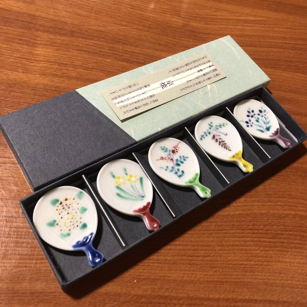 - 〈送料無料〉箸置き うちわ 五草花 清水焼 芳山 紫陽花 藤 四季 花 団扇 京焼 箸置 はしおき