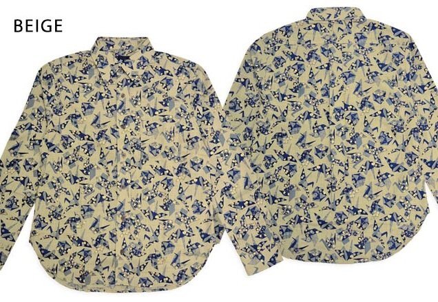 - 古布調 長袖レギュラーカラーシャツ「折り鶴」◆衣櫻◆衣櫻 ベージュMサイズ SA-1666 和柄 和風 折紙 日本製 国産
