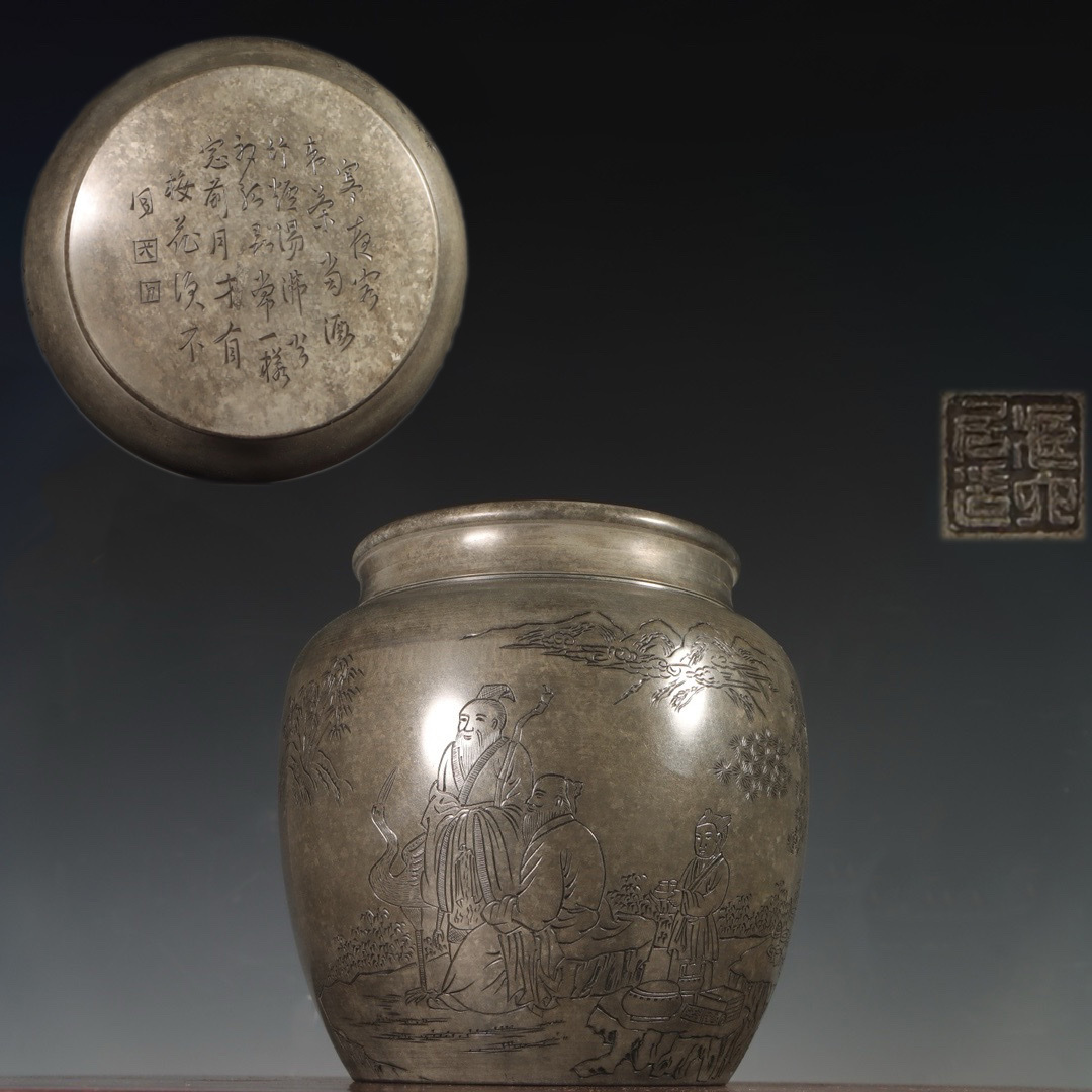 - 古錫 茶葉罐 蔵六居造 「錫刻人物詩文大口徑茶心壺」 茶筒 茶入 茶壷 茶道具 純錫 金工 茶器 時代物 茶香雅韻 LT-2412198