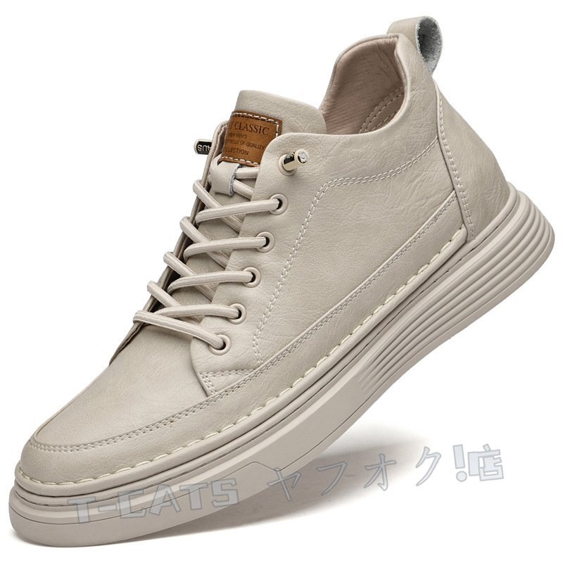 - 新品スニーカー 牛革 ショートブーツ 身長アップ 本革レザーシューズ メンズシューズ 滑り止め 白靴快適無地お洒落 24cm~27.5cm ベージュ