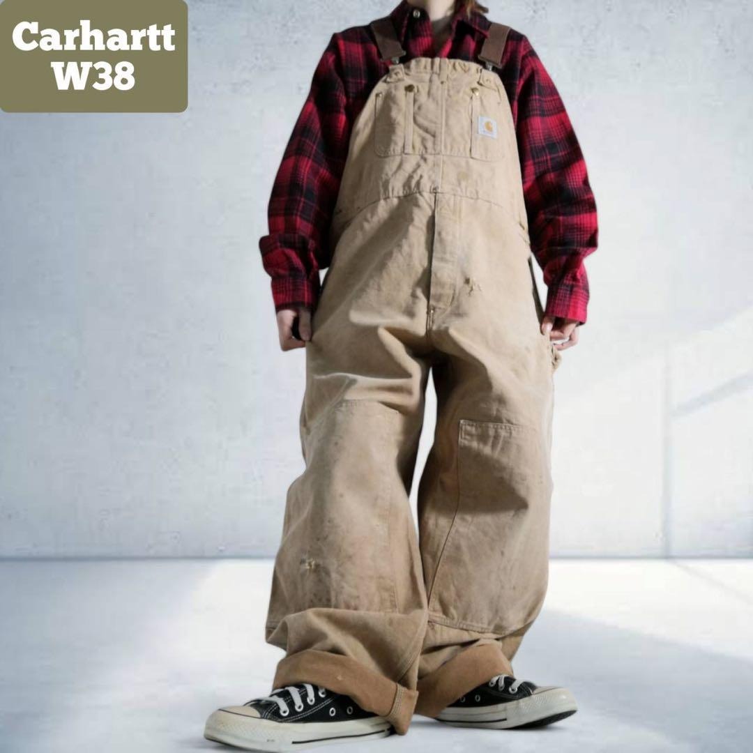 - カーハート Carhartt ダック地 オーバーオール つなぎ ダブルニー ワーク パンツ ベージュ メンズ W38 オールド ヴィンテージ 古着