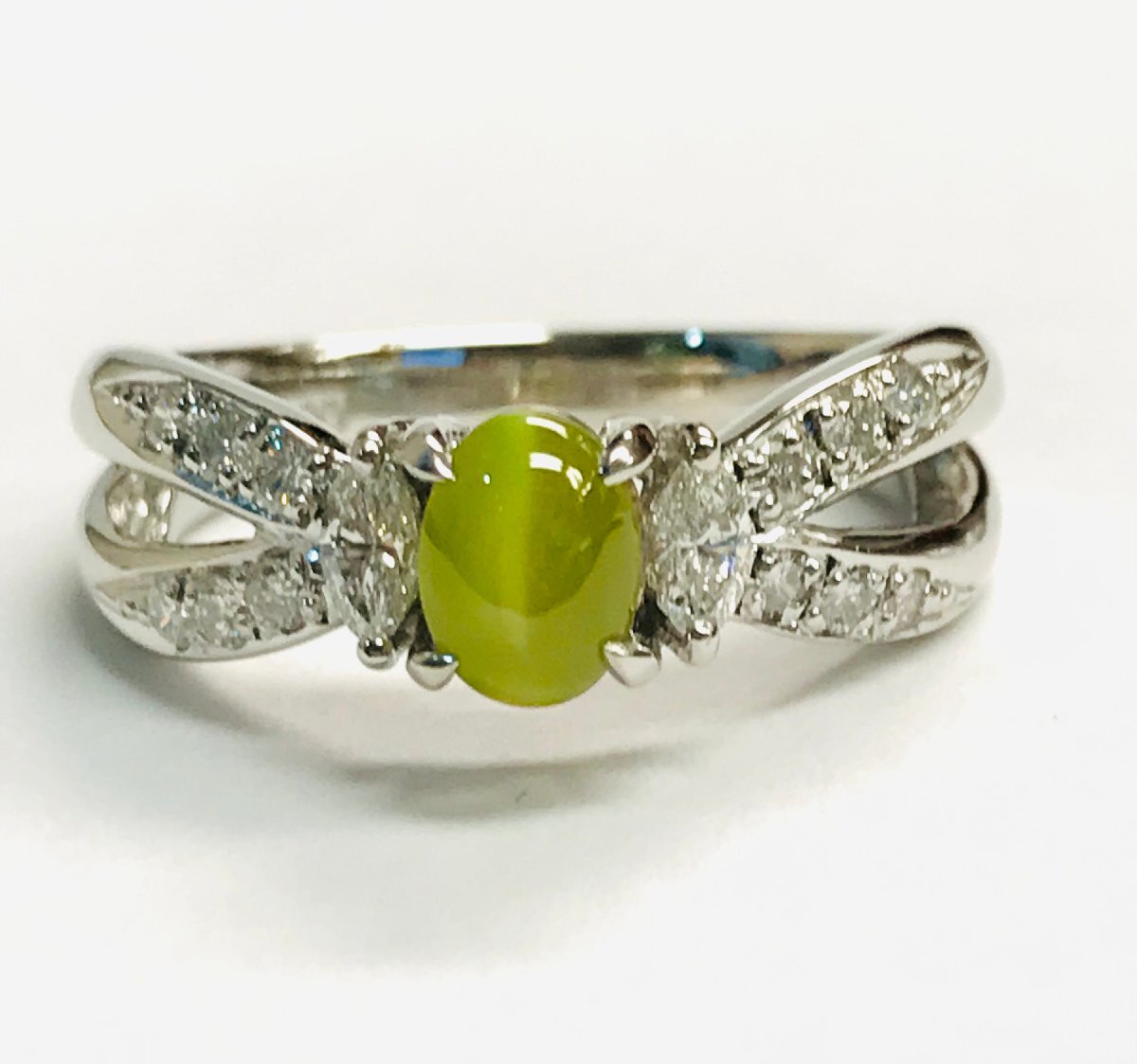 - qoj.Z4805 PT900 天然クリソベリルキャッツアイ ダイヤリング 中石0.90ct/枠石0.34ct 12号 ソーティング付き