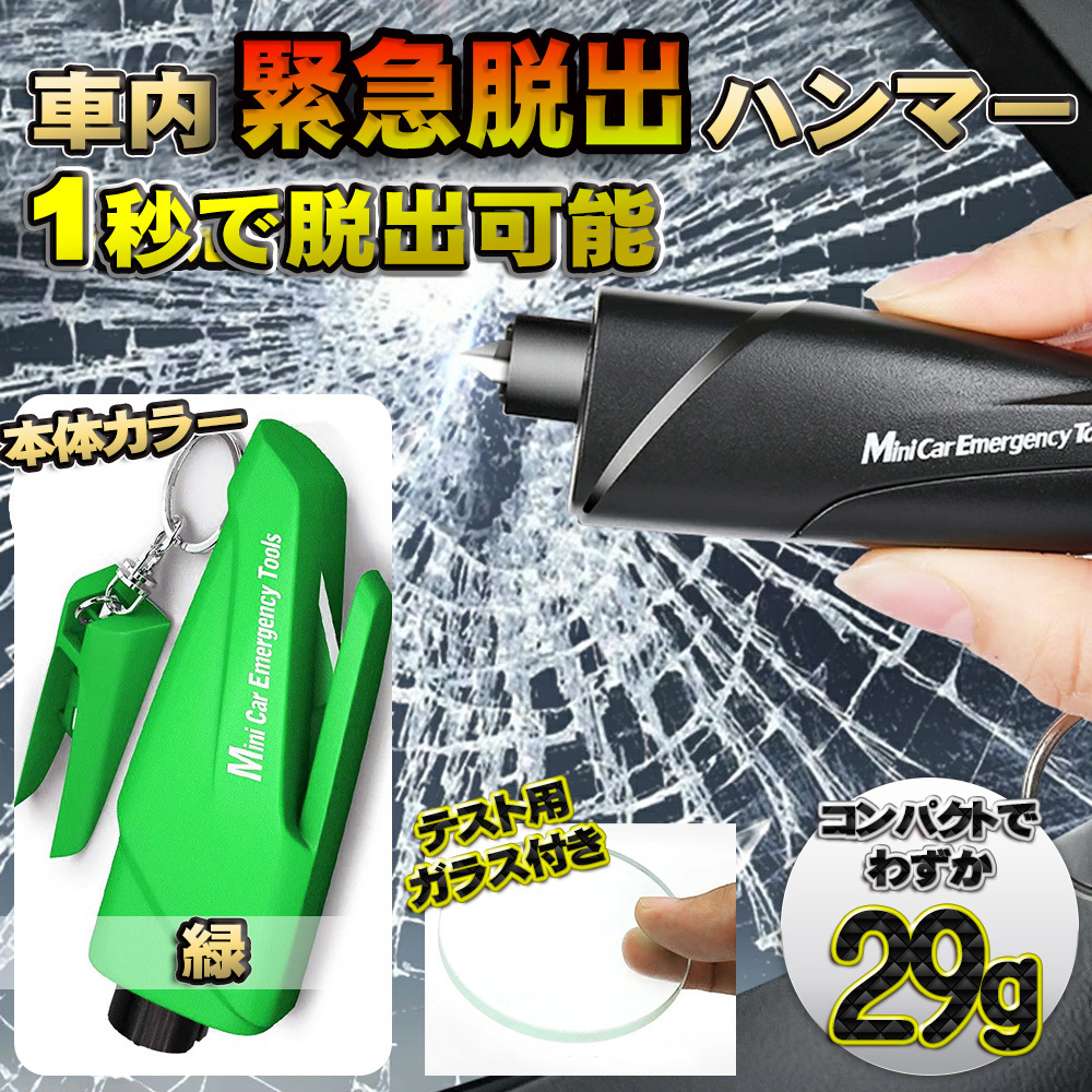 - 【グリーン】脱出 水中適用レスキューハンマー 水害対策に 緊急 脱出用 安全ハンマー 水没 車用 ポンチタイプ シートベルトカッター付