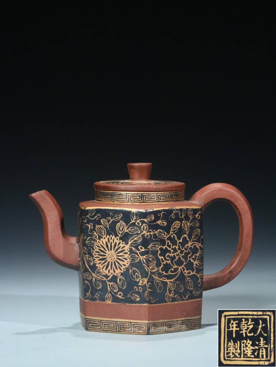 > 茶器 紫砂壷 『大清乾隆年制』在銘『黒釉蒔絵六方壺』茶壺常滑 茶壺 煎茶器 唐物 時代物 古陶芸 LB-12293
