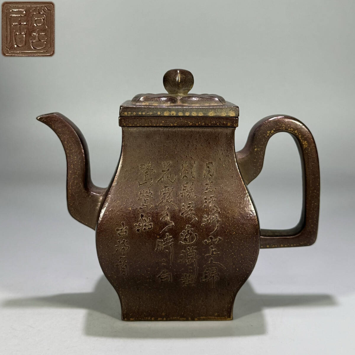 - 古陶芸 紫砂壷 清時代 【尚古居】 在銘 「琺瑯金泥絵四方菱花宮灯壺」 紫泥 煎茶 急須 茶道具 唐物 時代物 茶器 容量360cc LT-250112