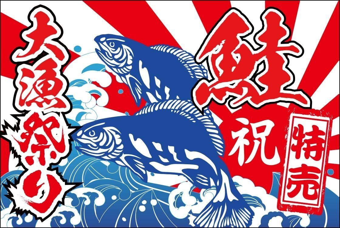 - タペストリー横断幕「鮭大漁祭り」大漁旗 大漁祭 鮭特売 サケ特売 サーモン シャケ特売 海の幸 いくら イクラ 新鮮魚介 北海道」送料360円