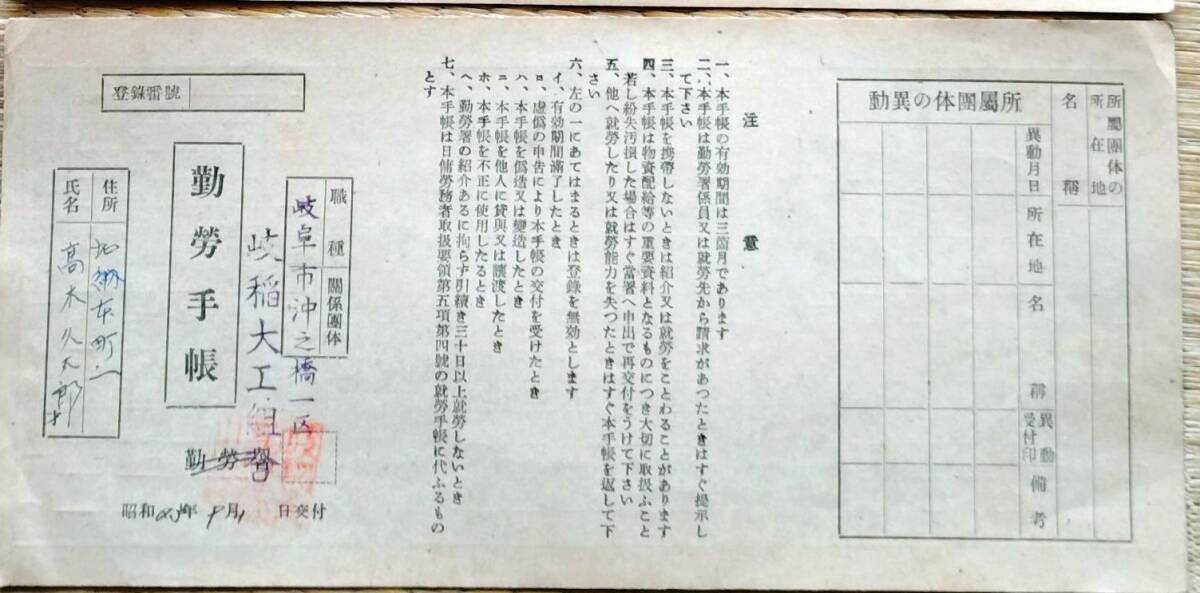 - f25010514〇大工組合勤労手帳 岐阜県 昭和23年〇和本古書