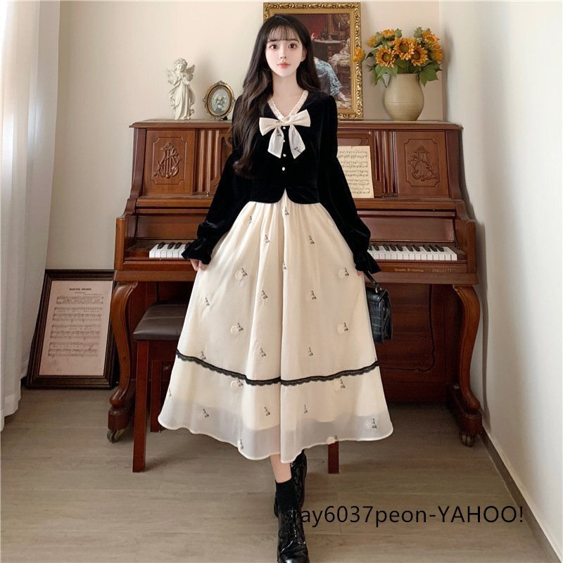 > 可愛い ロングワンピ フリル 長袖 リボン 花柄ししゅう きれいめ かわいい 大きいサイズあり 5L ブラック