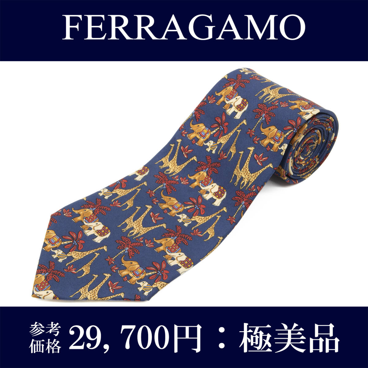 - 送料無料 フェラガモ ネクタイ ワイドタイ シルク ネイビーブルー 茶色 ブラウン 赤 レッド ブランド 動物 キリン 象 マーク 綺麗 N620