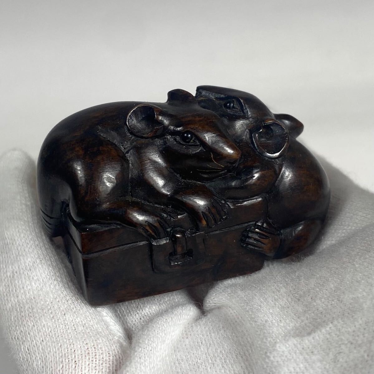 - 吉利造 根付作家 根付 提げ物 唐木 紫檀 繊細彫刻 彫刻 時代物 ネズミ 鼠 2匹のネズミと宝箱