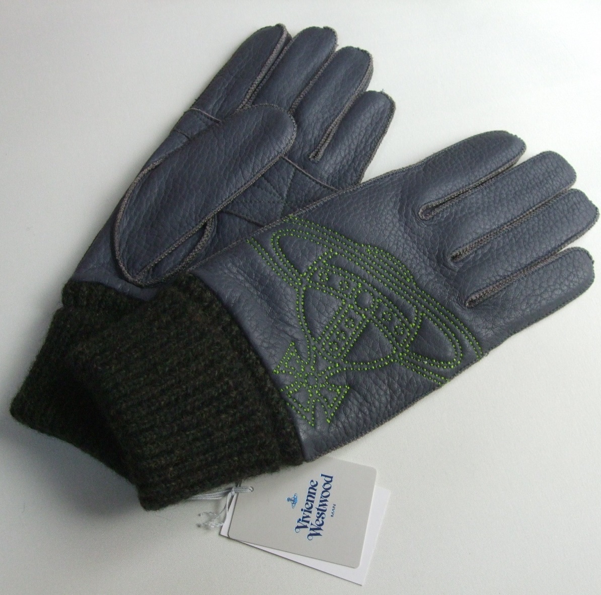 - 紳士用 ヴィヴィアン・ウエストウッド Vivienne Westwood MAN 鹿革 レザーグローブ 手袋 24㎝ 未使用品 オーブ刺繍 グレー系 百貨店