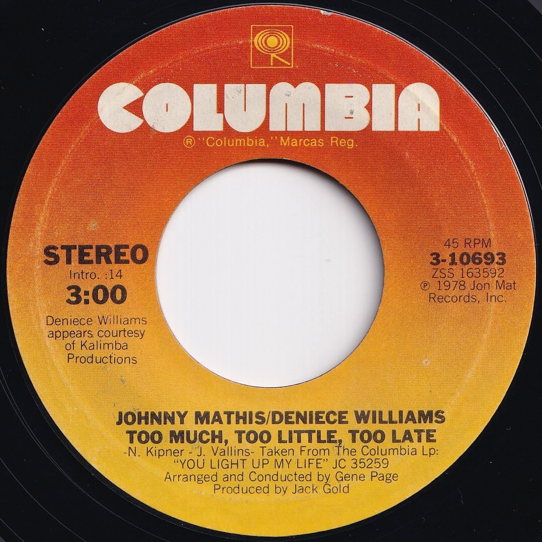 - Johnny Mathis, Deniece Williams Too Much, Too Little, Too Late / Emotion Columbia US 3-10693 209168 ソウル レコード 7インチ 45