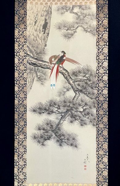 - SM8101[真作]分部五鈴「尾長鳥図」掛軸 絹本 花鳥図/昭和時代の画家 今尾景樹 西村五雲師事 三重の人