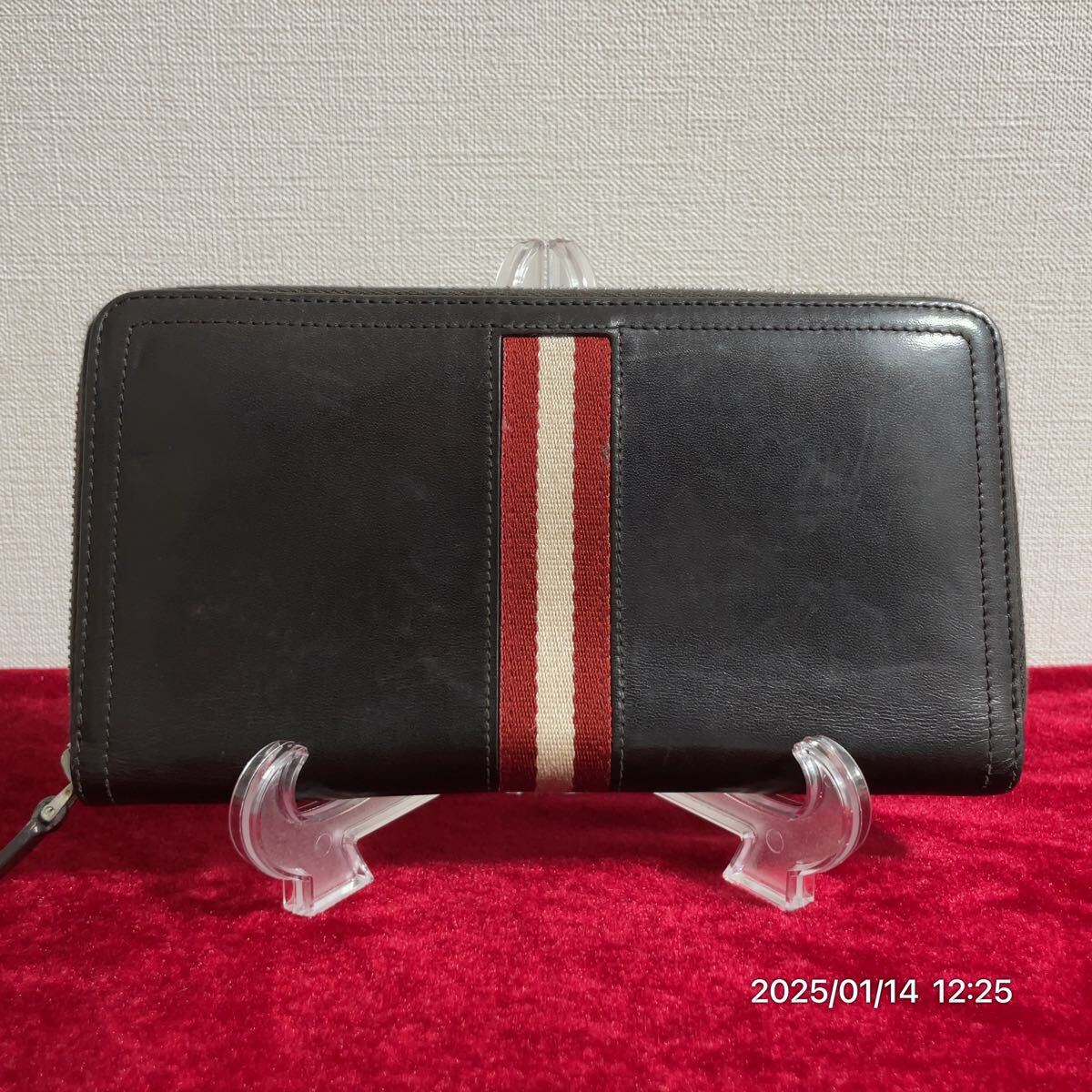 - BALLY バリー レッド×ホワイトライン ブラウンカラー レザー 革 ラウンドファスナー ウォレット 長財布