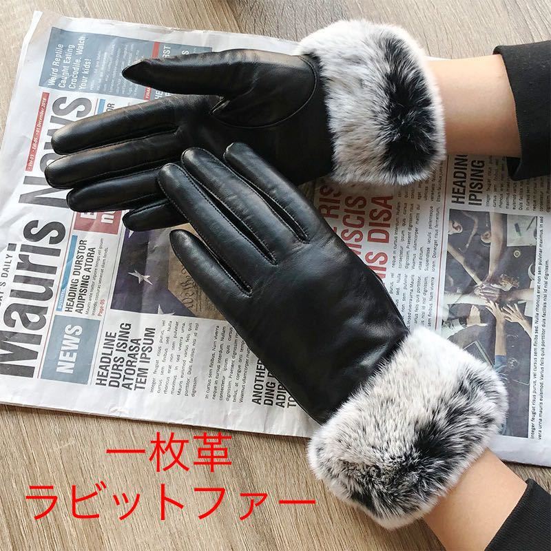 - 新品・高級◆レディース一枚革グローブ・レザー手袋ラビットファー 裏起毛 暖かい♪ ブラック