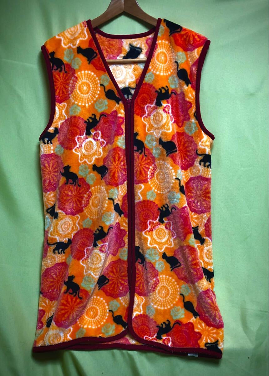 - 猫柄フリースジップアップベスト Mサイズ ちょっと派手なカラーがかわいいused