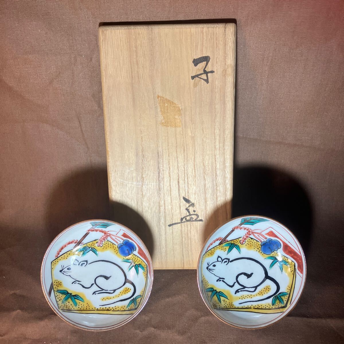 - 越田健一郎造 子 盃 一対 共箱 九谷焼 酒盃 盃 酒器 ぐい呑 ぐい呑み お猪口 色絵