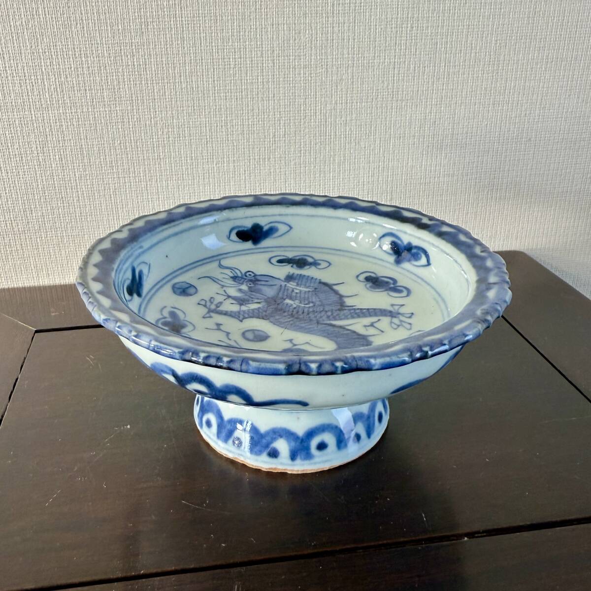 - 時代 中国美術 古染付 明時代 雲龍文 高杯 / 唐物 古陶磁器 青花 古美術 骨董 古玩 茶道具 煎茶道具 茶器 呉須 芙蓉手 菓子鉢 高台鉢