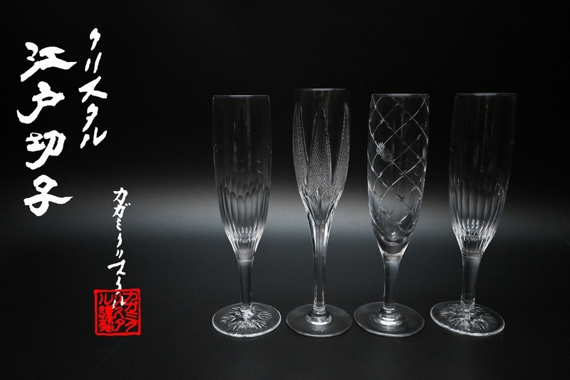 - シャンパングラス 江戸切子■伝統工芸士[鍋谷淳一 鍋谷聰 根本達也 篠崎英明] 4客[h約21.5cm]■カガミクリスタル 栞 ■