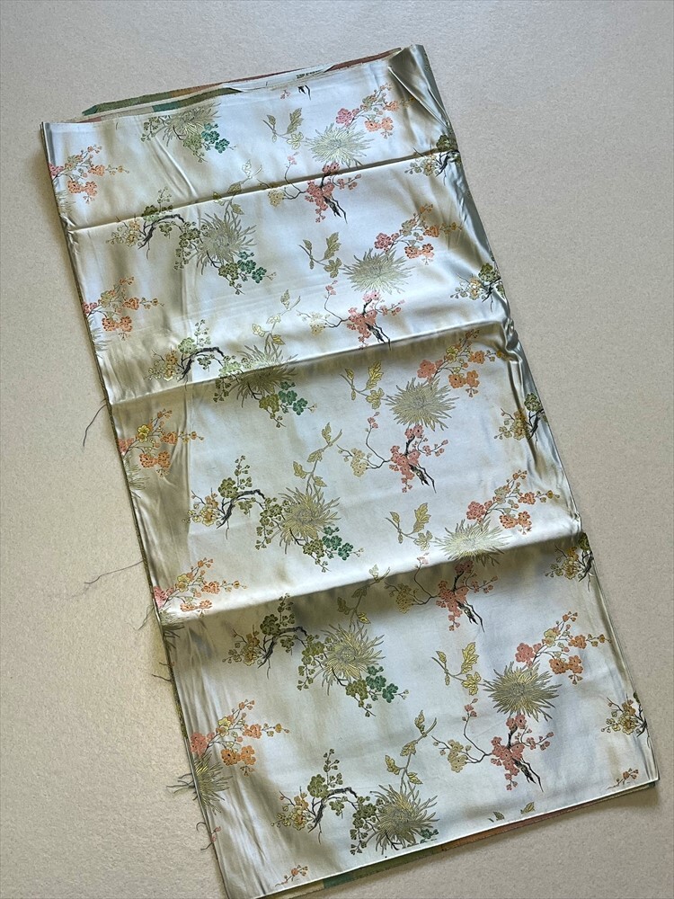 - 花とら●リサイクル生地 中国風 チャイナ服用 サテン 灰ベージュ 花 リメイク 素材 細工用 250102