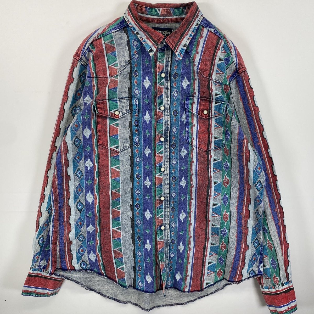 - 古着 80's~90'sヴィンテージ ラングラー Wrangler デニム 長袖シャツ マルチカラー ウエスタンシャツ スナップボタン 17 2/1-36 XL