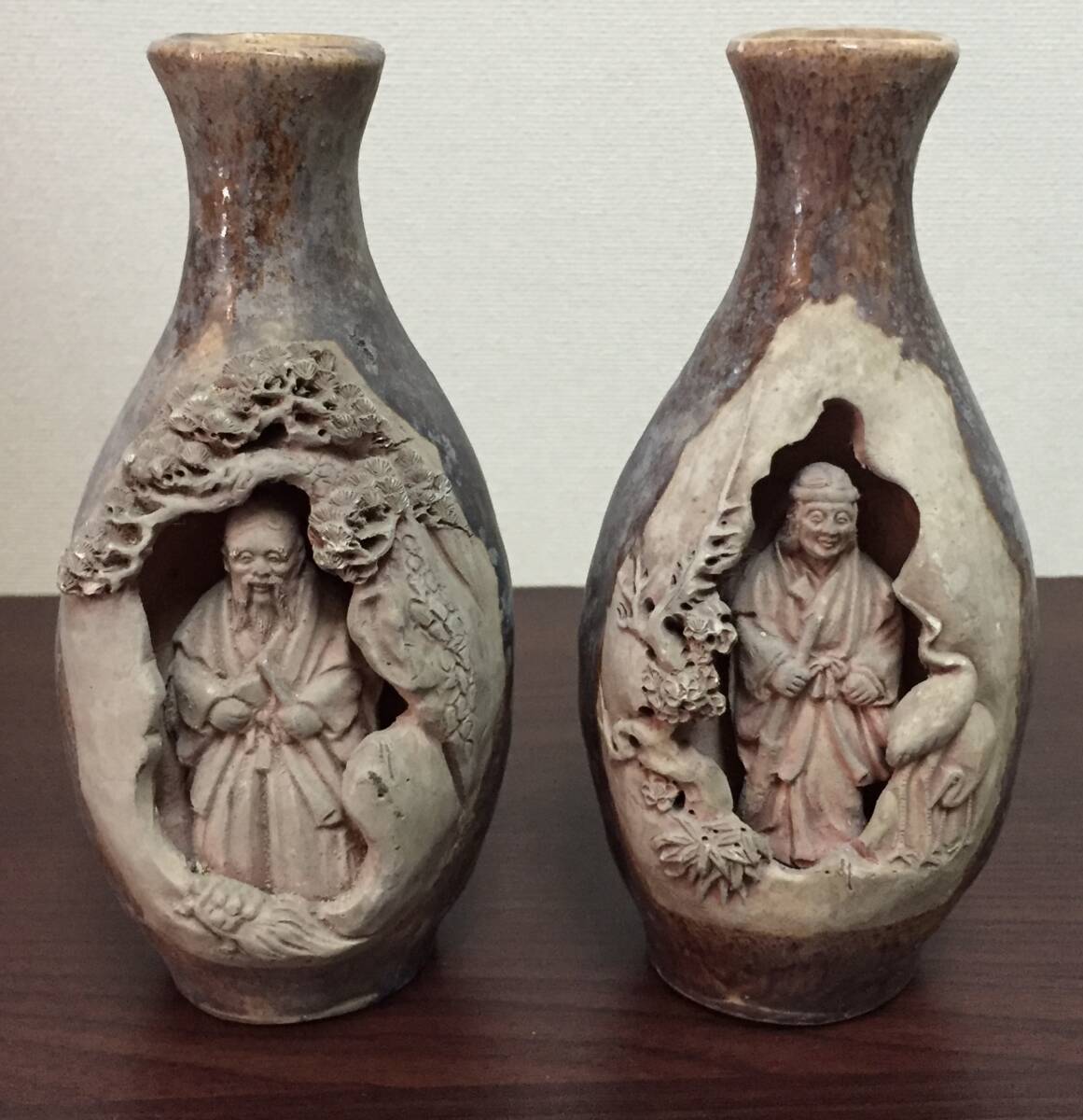 > 時代 徳利 一対 翁 媼 彫刻徳利 松鶴亀花図 細密彫刻 酒器 古美術品 検)二六焼 一角焼