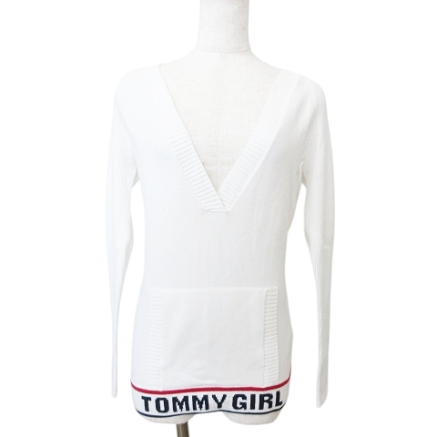> 未使用品 トミーガール tommy girl タグ付き 長袖 ニット Vネック セーター ロゴ ワンポイント トップス Sサイズ 白 ホワイト レディース