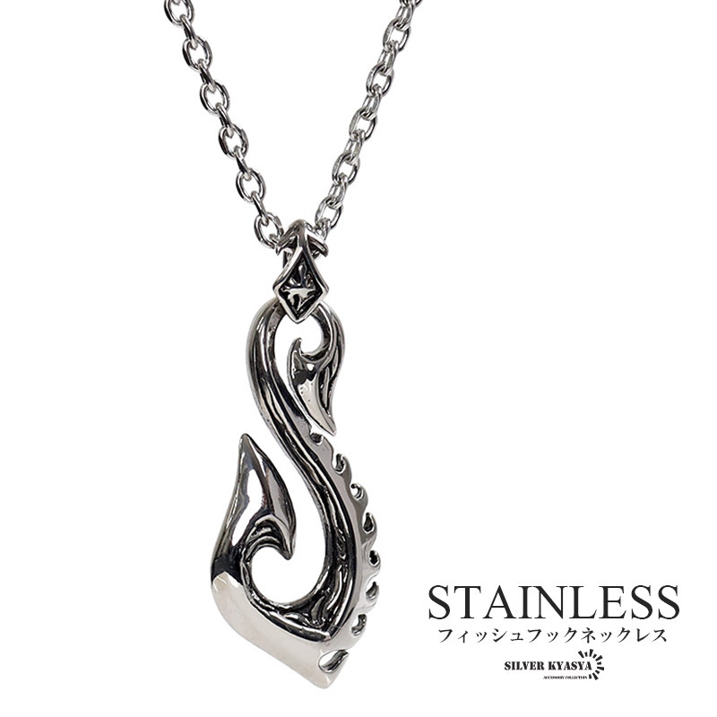 - ステンレス 釣り針 ネックレス 唐草 ペンダント 炎 フィッシュフックネックレス ペンダント 小豆チェーン