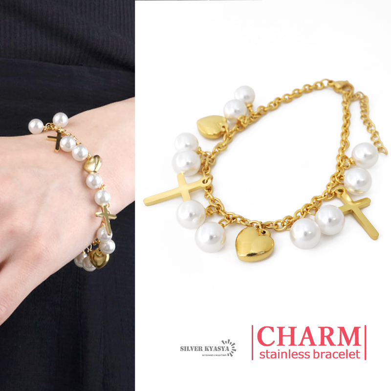- チャームブレスレット ステンレス ゴールド パール あずき チャーム クロス 十字架 ハート アジャスター 金属アレルギー