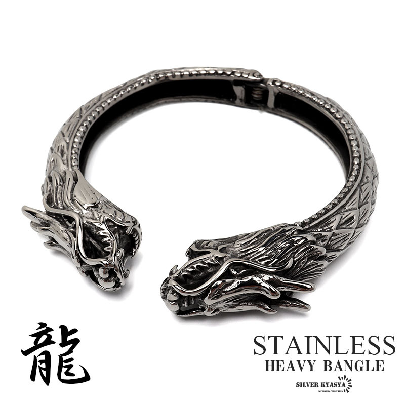 - ステンレス ドラゴンバングル 龍 ごつめバングル ブレスレット シルバー 開閉式 重厚感 金アレ対応