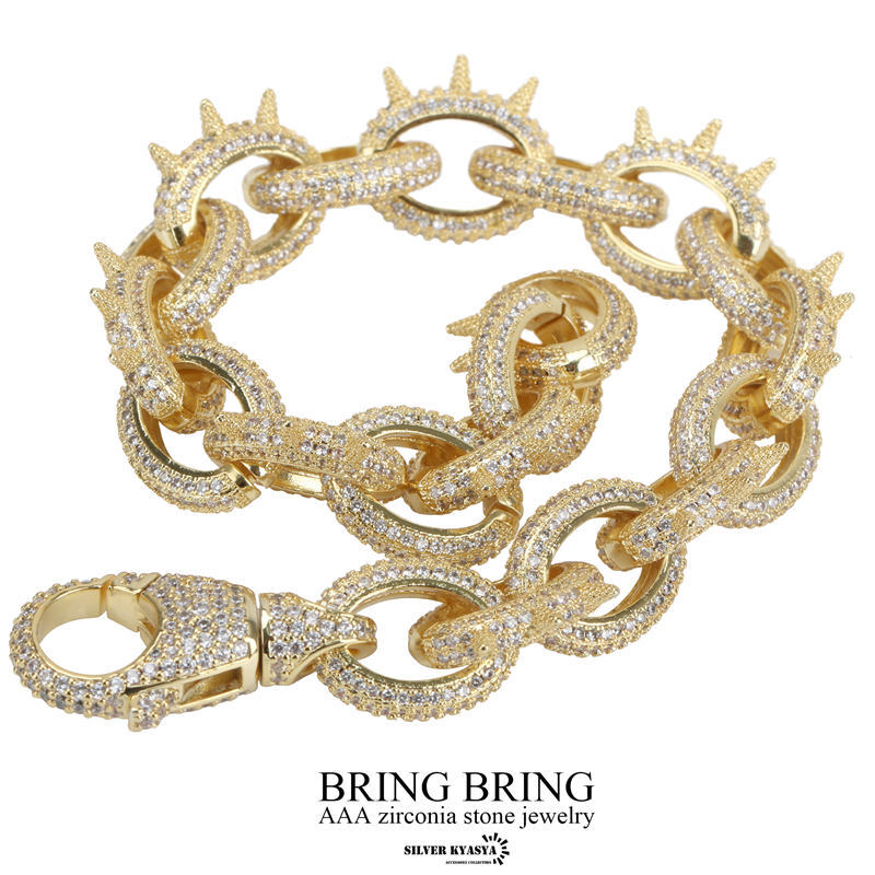 - ブリンブリン あずき トゲ 鋲 チェーン ブレスレット パヴェ 爪留め AAA 宝石 18金 小豆 ゴールド 18K ボックス付属