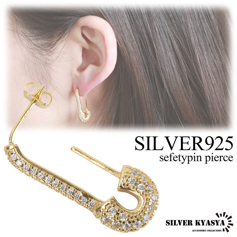 - シルバー925 安全ピンピアス スタッドピアス ゴールド パヴェ 18KGP シルバー セーフティピン アレルギー対応 片耳用