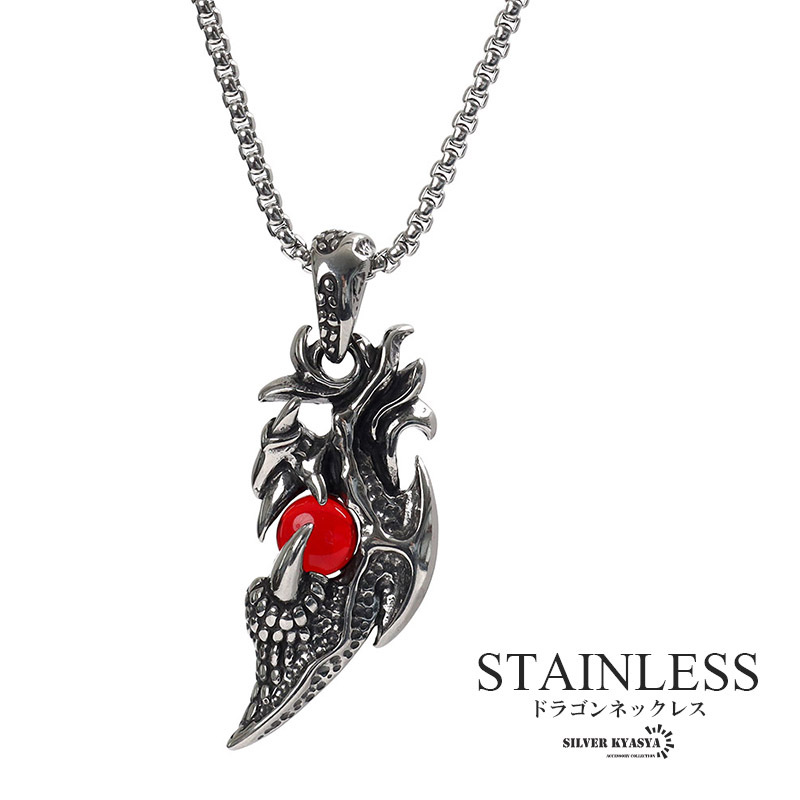 - ステンレス 龍の爪 ネックレス シルバー ごつい ガーネット ペンダント ドラゴンネックレス 渋い レッドストーン