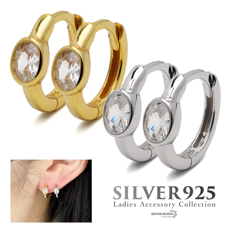 > (シルバー) ピアス フープピアス 一粒ピアス シルバー925 18KGP CZ オーバル ホワイト 白 両耳用 2点セット