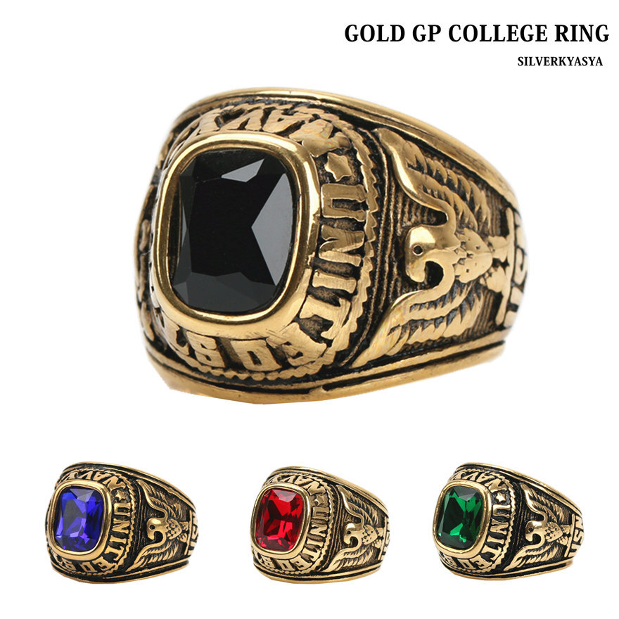 - (ブラック、26号) ステンレス ゴールド カレッジリング 指輪 大粒 ストーン ブラック レッド ブルー グリーン